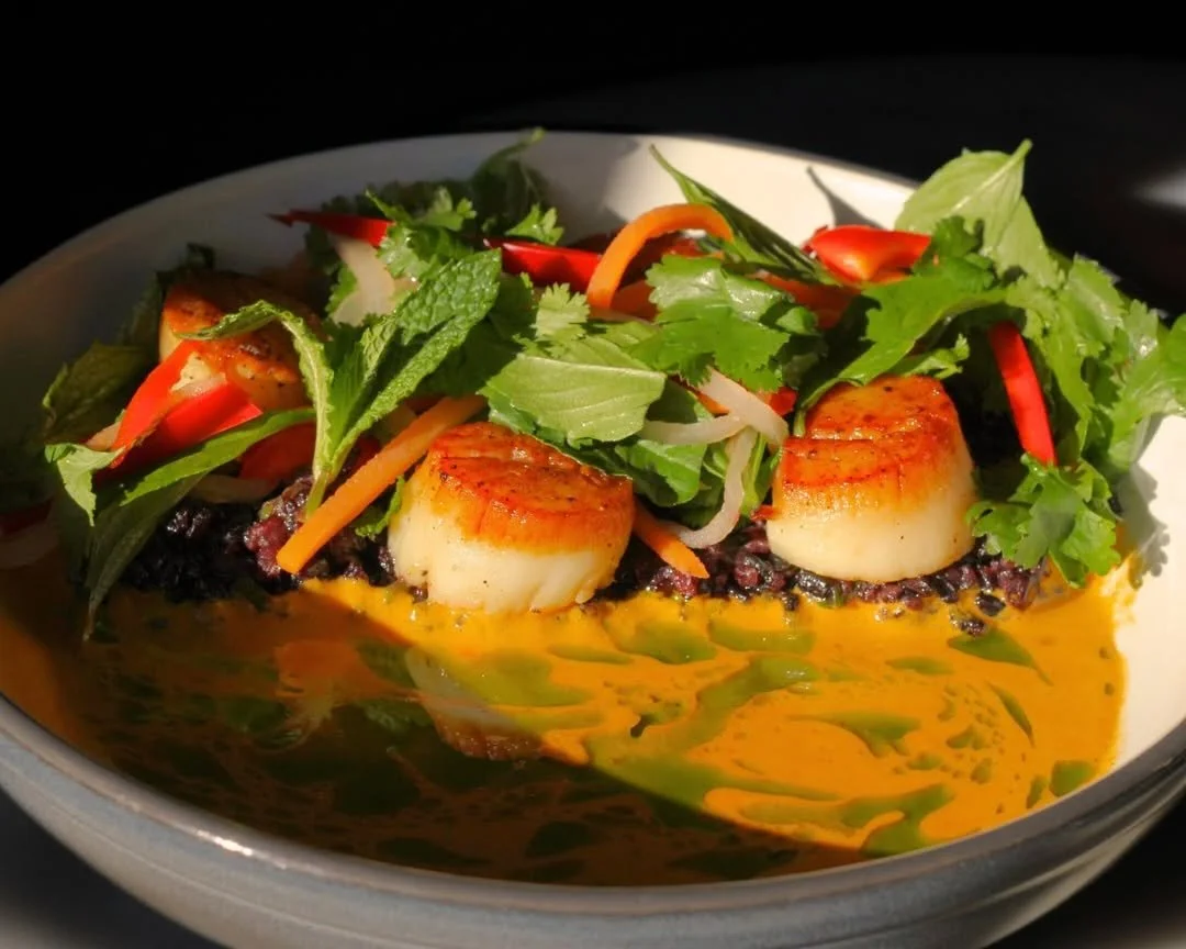 forbidden black rice, thai coconut chili broth, red pepper, pickled carrots & daikon radish, mint, thai basil, cilantro